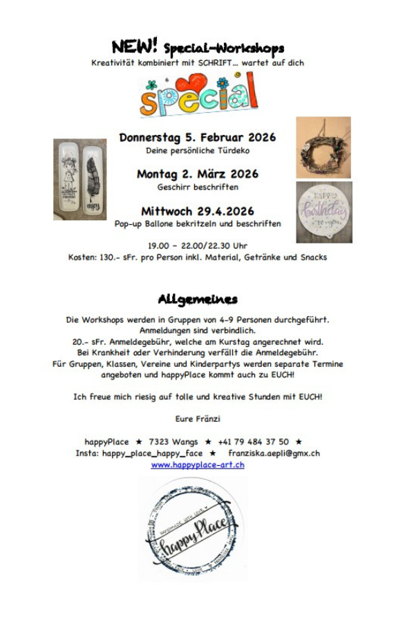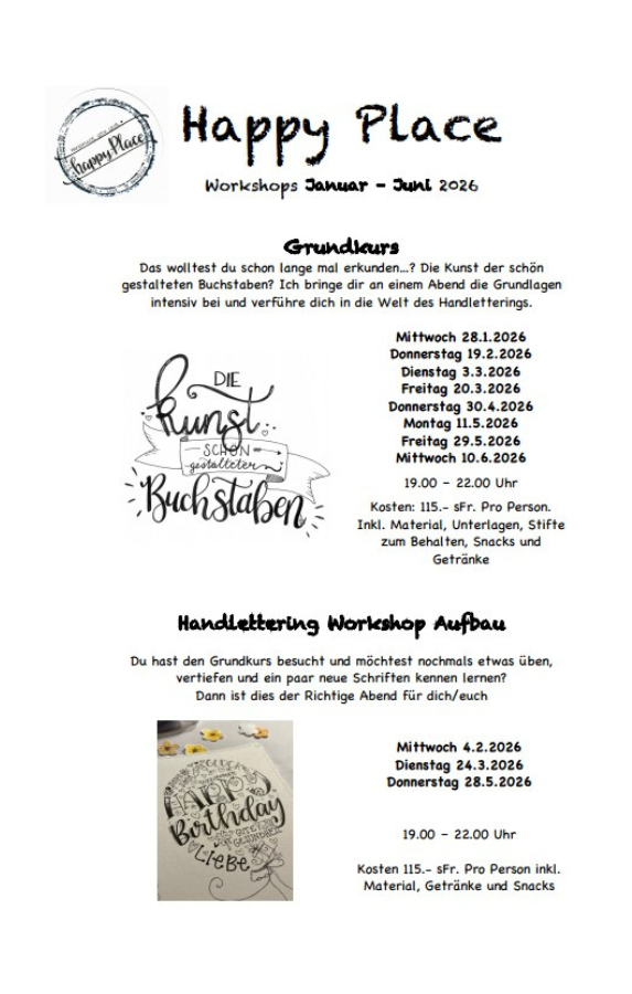 happyWorkshopsGönn’ Dir eine Auszeit und erlerne tolle Techniken. Gestalte Deine eigenen Kunstwerke, mit denen du Deine Familien und Freunde beschenken kannst. Denn, von Herzen handgemacht ist immer das schönste Geschenk.